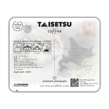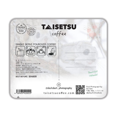 エゾタヌキが引っ越しをしている写真です。先頭の子が立ち止まると、後ろの子たちが何が起きたのかと覗いていました。可愛らしいですよね。 TAISETSU COFFEEの代表とも言える人気のフォトシリーズ。 北海道の風景や動物の写真が鮮やかにプリントされ、まるでポストカードのようなパッケージです...